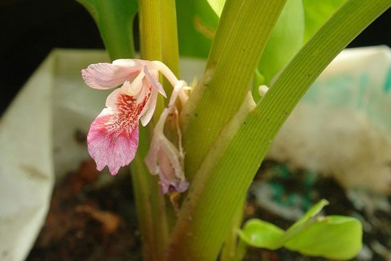 • ดอกกระชาย ออกดอกเป็นช่อแบบช่อเชิงลด โดยจะออกที่ยอดระหว่างกาบใบคู่ในสุด มีความยาวประมาณ 5 เซนติเมตร แต่ละดอกจะมีใบประดับ 2 ใบ มีสีขาวหรือสีขาวอมชมพูอ่อน ๆ เป็นรูปใบหอกกว้างประมาณ 8 มิลลิเมตร และยาวประมาณ 3.5-4.5 เซนติเมตร ที่กลีบเลี้ยงมีสีขาวหรือสีขาวอมชมพูอ่อน โคนติดกันเป็นหลอด ยาวประมาณ 1.7 เซนติเมตร ปลายจะแยกเป็น 3 แฉก ส่วนกลีบดอกมีสีขาวหรือสีขาวอมชมพูอ่อน โคนติดกันเป็นหลอด ยาวประมาณ 6 เซนติเมตร และปลายแยกเป็น 3 กลีบ เป็นรูปใบหอก มีขนาดไม่เท่ากัน กลีบใหญ่มี 1 กลีบ กว้างประมาณ 7 มิลลิเมตรและยาวประมาณ 1.8 เซนติเมตร ส่วนอีก 2 กลีบจะมีขนาดเท่ากัน กว้างประมาณ 5 มิลลิเมตร และยาวประมาณ 1.5 เซนติเมตร มีเกสรตัวผู้อยู่ 6 อัน แต่มี 5 อันที่เปลี่ยนไปมีลักษณะเหมือนกลีบดอก โดย 2 กลีบบนมีสีชมพู รูปไข่กลับขนาดเท่ากัน มีความกว้างประมาณ 1.2 เซนติเมตร และยาวประมาณ 1.7 เซนติเมตร ส่วนอีก 3 กลีบล่างมีสีชมพูติดกันเป็นกระพุ้ง มีความกว้างประมาณ 2 เซนติเมตร ยาวประมาณ 2.7 เซนติเมตร และที่ปลายจะแผ่กว้างประมาณ 2.5 เซนติเมตร มีสีชมพูหรือสีม่วงแดงเป็นเส้นอยู่เกือบทั้งกลีบ โดยเฉพาะอย่างยิ่งตรงกระเปาะและปลายกลีบ จะมีเกสรตัวผู้ที่สมบูรณ์อยู่ 1 อัน ก้านชูอับเรณูหุ้มก้านเกสรตัวเมีย