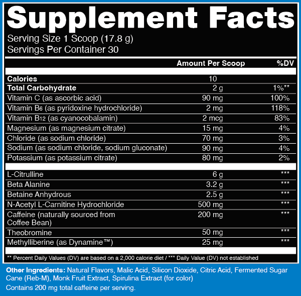 This is 30 full servings, weighing in at 17.8 grams, providing 200 milligrams of caffeine. As we’ll discuss, this allows for safe 1.5 to 2-scooping, and Brian and his team did a fantastic job flavoring the three difficult-to-flavor ingredients (caffeine, theobromine, and Dynamine).
