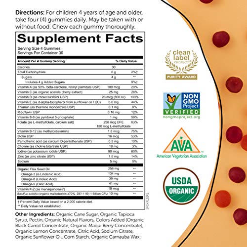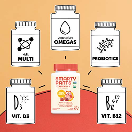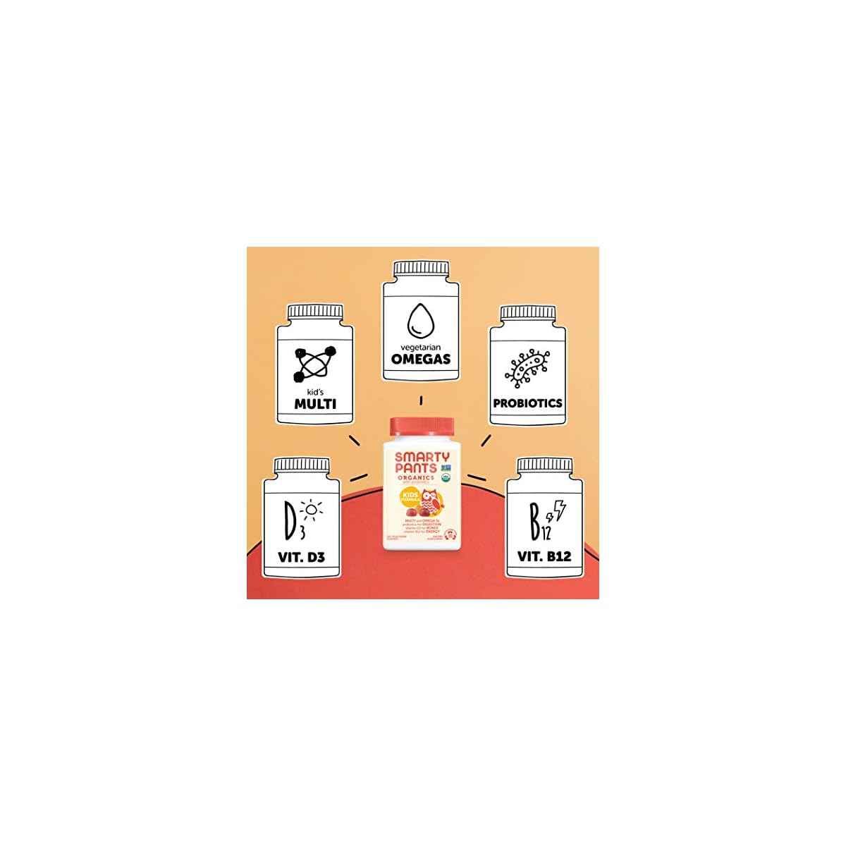 SmartyPants Organics Kids Complete is a vegetarian multifunctional dietary supplement formulated with parents in mind. We know getting your kids to eat healthy can be a chore. That’s why we carefully-select the most premium organic ingredients and pack them into one nutrient-dense and delicious gummy that kids of all ages love. Each delicious gummy delivers vegetarian omega-3, probiotics,* and 14 essential nutrients, including vitamin D as D3, B-vitamins, and zinc. They are also an excellent source of vitamins A, C, D, E, B6, B12, folate, biotin, and iodine.”