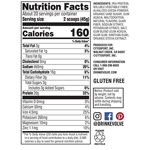 Evolve Plant Based Protein Powder, Double Chocolate, 20g Vegan Protein, Dairy Free, No Artificial Flavors, Non-GMO, 3g…