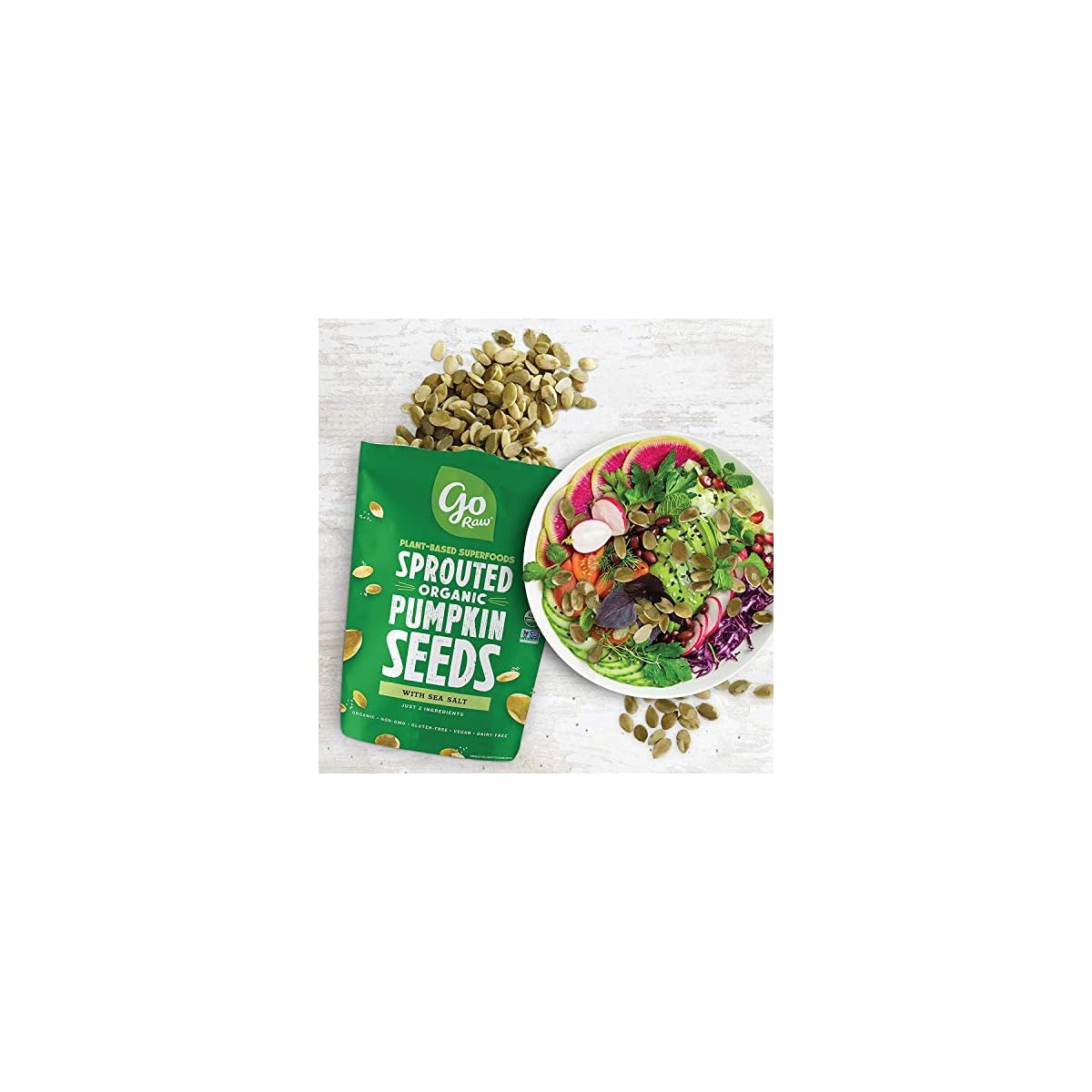 Go Raw Sprouted Pumpkin Seeds have 9g protein per serving and are handcrafted using only 2 simple, high-quality ingredients. Go Raw sprouted seeds are minimally processed—sprouted and dried, never roasted, baked, or fried—for a light crunchy texture and the nutrition, protein, and energy you need to fuel your day. Add Go Raw Sprouted Pumpkin Seeds to your salads, sandwiches, yogurt, trail mixes, and soups for added flavor and crunch…or eat them as a snack right out of the bag!