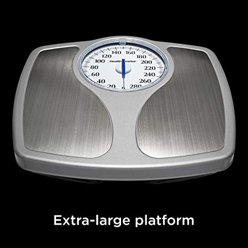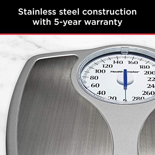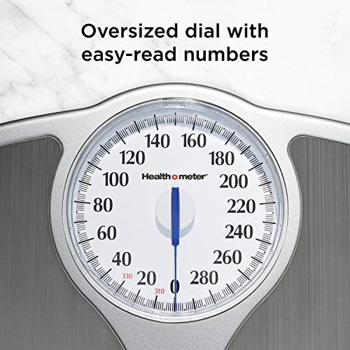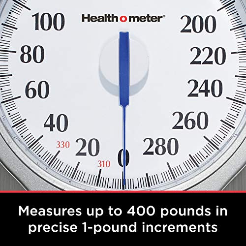 The Health-O-Meter Oversized Dial Personal Scale provides a simple, reliable way to measure and monitor your weight. This analog bathroom scale accurately measures up to 400 pounds in precise 1-pound increments. The oversized 5.5-inch dial, large numbers, and bright red pointer make it easy to read your weight at a glance. The bathroom scale’s spring-powered analog design means that it never needs batteries. Measuring 12.8 inches by 12.8 inches, this personal scale features a soft-touch, extra large platform that makes it comfortable to use. This scale is built to last. Its solid steel frame provides additional stability and durability. It also includes a 5-year limited warranty. With its elegant stainless steel accents and easy-to-clean design, this scale is ideal for use in a variety of settings.