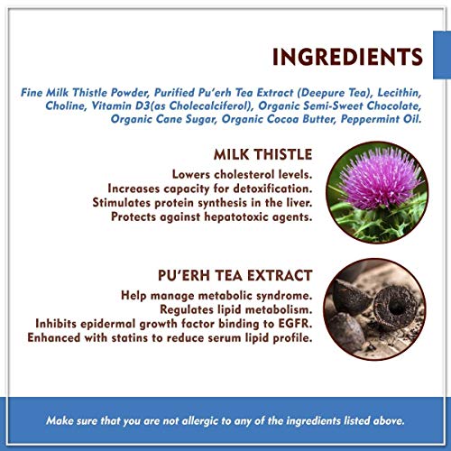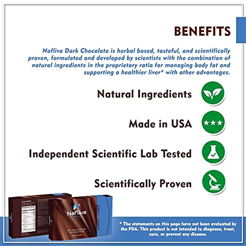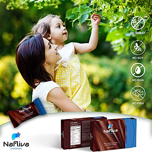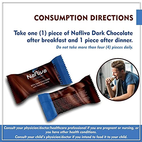 MADE IN THE USA, Nafliva undergoes rigorous quality control protocols for your peace of mind and to ensure product potency and consistency. KEEP YOUR LIVER THRIVING, as the largest organ in your body, it removes toxins from your body and supports all other vital functions. Nafliva Dark Chocolate is a tasty and potent formula that promotes detox, cleansing and the inhibition of fatty liver deposits. Patented Composition, scientifically proven blend includes Fine Milk Thistle Powder, Pu-reh Tea Extract, Lecithin, Choline, Vitamin D3 and other natural ingredients more Effectively Enter Liver Cells Detox the Fatty Liver* to help manage body fat and support liver care to boost liver functions and energy levels* SUPPORTS WHOLE-BODY WELL-BEING by promoting greater resistance to secondary ailments of NAFLD*. The Liver is a hero for your life, but it can get tired day and night in filtering those unnatural toxins that are gradually deposit in it causes harm. This revolutionary Nafliva Dark Chocolate will help to transform your overall health & wellness*, one delectable chocolate morsel at a time. Ingredients: Fine Milk Thistle Powder, Purified Pu’er Tea Extract (Deepure Tea), Lecithin, Choline, Vitamin D3(as Cholecalciferol), Organic Semi-Sweet Chocolate, Organic Cane Sugar, Organic Cocoa Butter, Peppermint Oil. Please also refer to the Nafliva’s Nutrition Facts. Consumption Directions: Take one (1) piece of Nafliva Dark Chocolate after breakfast and 1 piece after dinner. Do not take more than four (4) pieces daily. Make sure that you are not allergic to any of the ingredients listed above. Consult your physician/doctor/healthcare professional if you are pregnant or nursing, or you have other health conditions. Consult your child’s physician/doctor if you intend to feed it to your child. NOT MANUFACTURED WITH WHEAT, SOY, EGG, FISH ETC. Store in room temperature and dry place. Best before March 2022