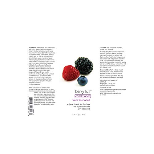 Condition: Fine, lifeless hair in need of volume, body and shine. Solution: Berry Full™ Conditioner provides a boost of volume to fine hair, providing a stunning difference in the feel and look. Biotin, panthenol, and algae extract add dramatic body and generate a beautiful shine. This cream based conditioner will re-establish moisture and provide full, healthy hair. Berry Full™ Conditioner is formulated with a unique herbal blend to protect and naturally nourish your hair and scalp. Free of abrasive ingredients that strip hair of its natural moisture and shine. NOW® Solutions products are not tested on animals.