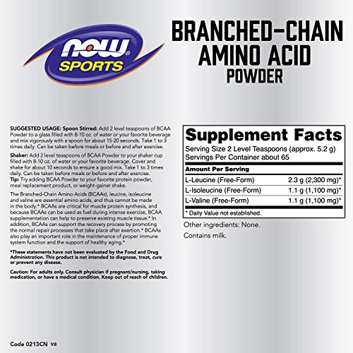 The Branched Chain Amino Acids (BCAAs) leucine, isoleucine and valine are essential amino acids and thus cannot be made in the body.* BCAAs are critical for muscle protein synthesis, and because BCAAs can be used as fuel during exercise, BCAA supplementation can help to preserve existing muscle tissue.* In addition, BCAAs can support the recovery process by promoting the normal repair processes that take place after exertion.* BCAAs also play an important role in the maintenance of proper immune system function and the support of healthy aging.* Natural color variation may occur in this product. Spoon Stirred: Add 2 level teaspoons of BCAA Powder to a glass filled with 8 – 10 oz. of water or your favorite beverage and mix vigorously with a spoon for about 15 – 20 seconds. Take 1 to 3 times daily. Can be taken before meals or before and after exercise. Shaker: Add 2 level teaspoons of BCAA Powder to your shaker cup filled with 8 – 10 oz. of water or your favorite beverage. Cover and shake for about 10 seconds to ensure a good mix. Take 1 to 3 times daily. Can be taken before meals or before and after exercise. Tip: Try adding BCAA Powder to your favorite protein powder, meal replacement product, or weight-gainer shake.
